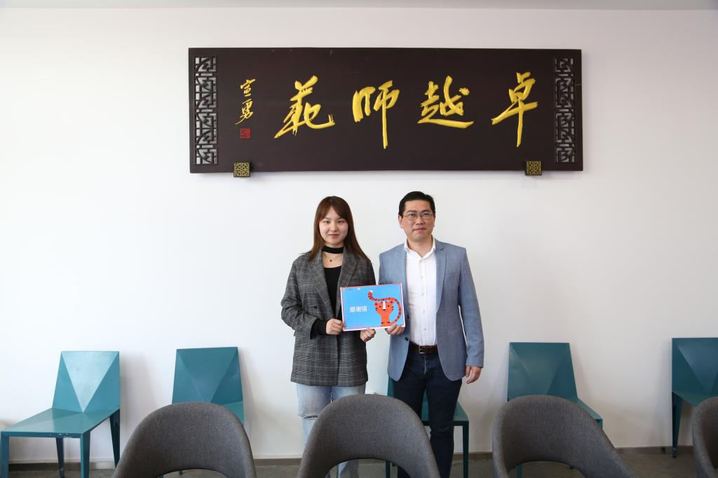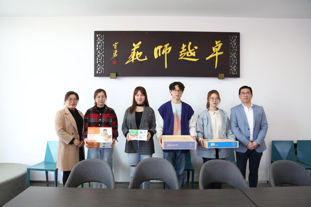 合作仪式上,吴经理为宁波欧蒙教育用品有限公司授牌“社会实践基地”,张总则为学前教育专业的员工赠送材料。