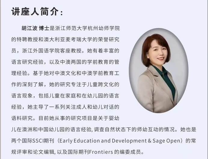 胡江波教授有着丰富的语言研究经验,及中澳两国的教育管理经验,发表国际期刊论文近二十篇,担任两个国际SSCI期刊的常规评审和论文编辑,以及国际期刊Frontiers in psychology的编委成员。
