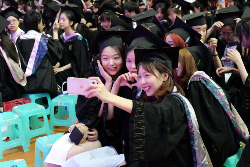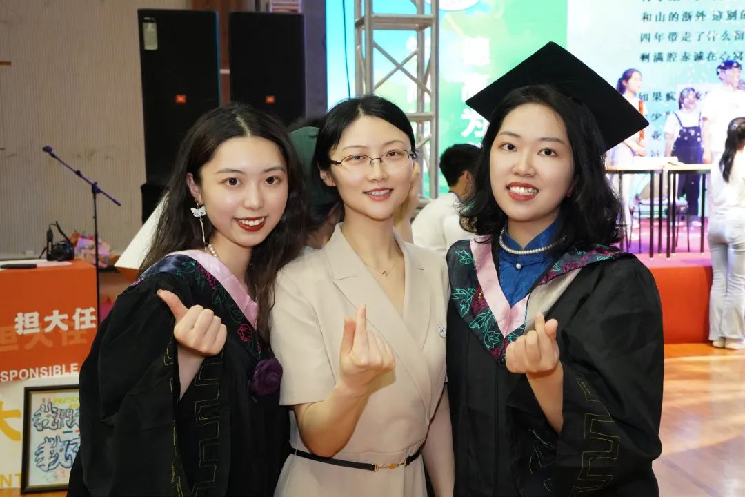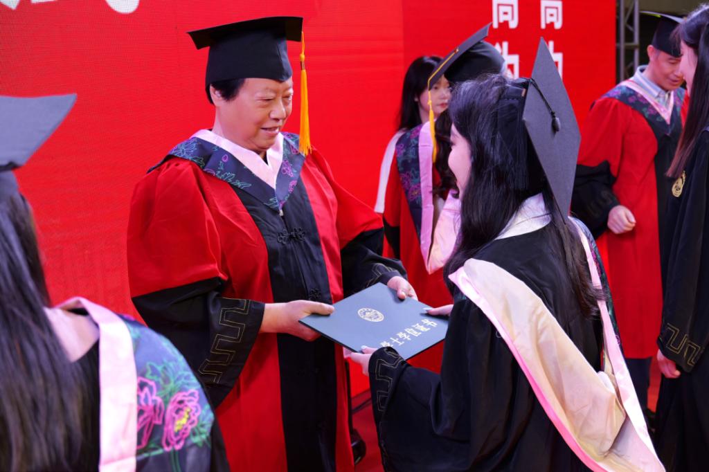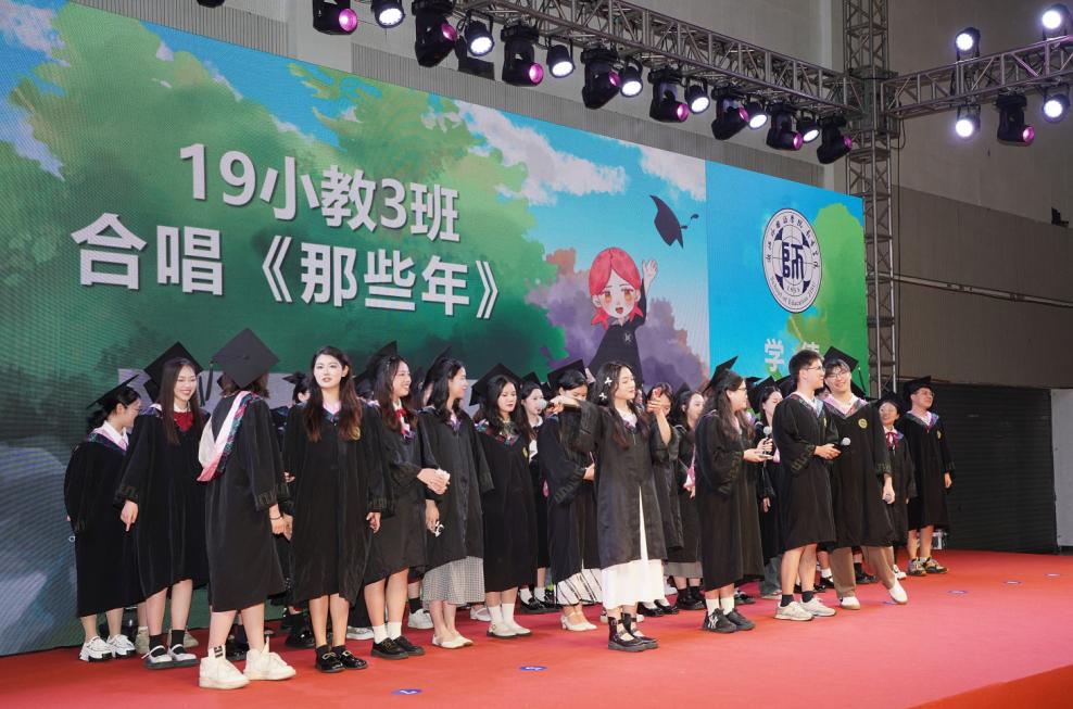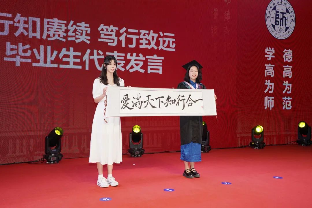 毕业生代表沈蕾围绕“踏实、奋斗、感恩”与毕业生们分享求学心得。博雅书画社社长徐沁将“爱满天下 知行合一”的书法作品赠予学弟学妹。