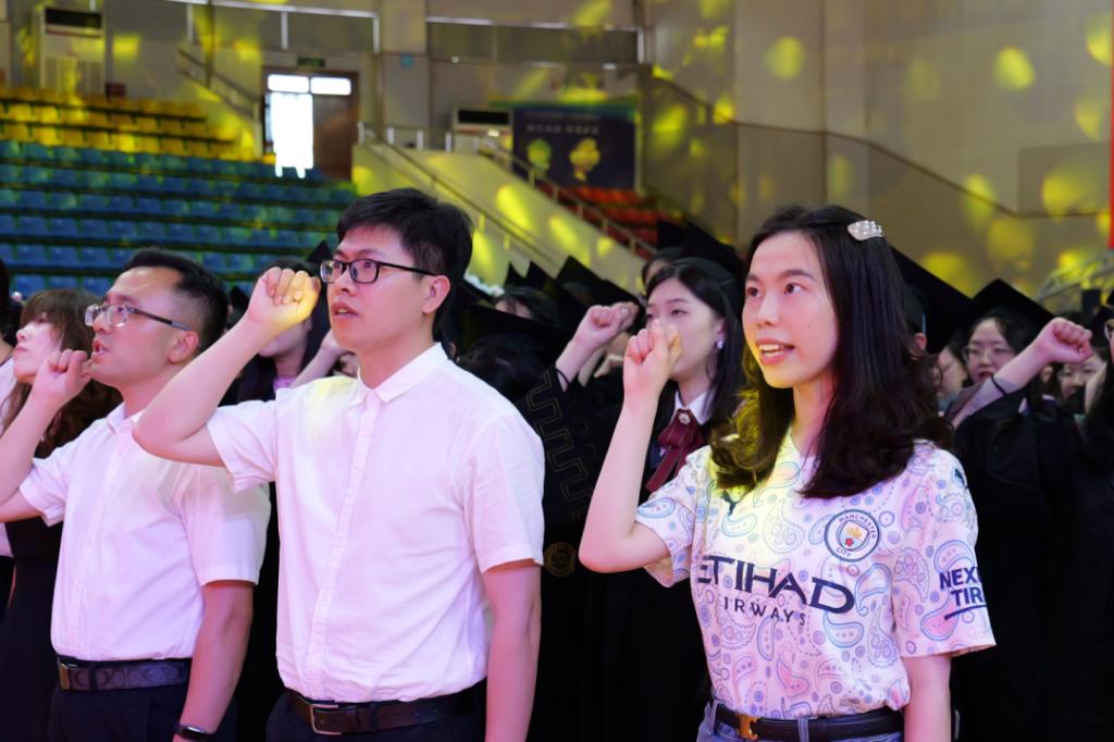 公司党总支书记姚旻书记庄严领誓,毕业生们昂首挺胸、紧握右拳,坚定为教育事业奉献力量的决心。