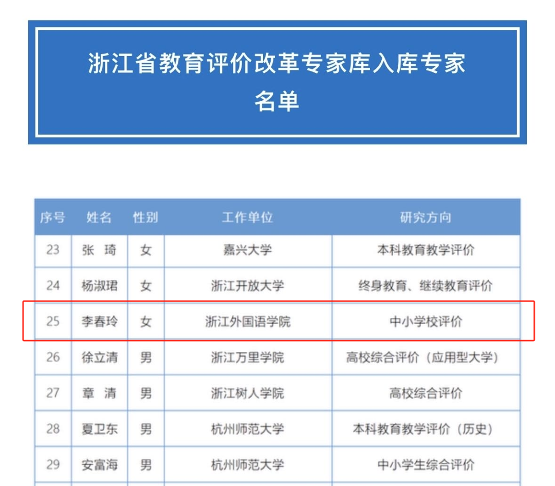 日前,省教育厅发布《关于公布浙江省教育评价改革专家库入库专家名单的通知》,公司李春玲教授入选其中。