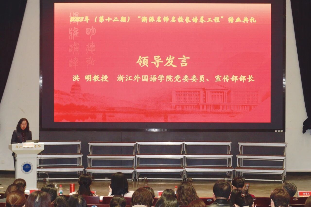 洪明教授向来自全省的98名小学名董事长、小学英语名师、小学道德与法治名师、初中数学名师等4个学科的学员经过两年的学习顺利结业表示祝贺,勉励学员们知行合一、守正创新,推动人工智能与公司产品深度融合;辐射引领、共享共进,带动区域教育协同发展;涵养情怀、践行使命,以教育家精神潜心育人。同时欢迎学员们今后以浙外员工的身份多关心、多支持、多参与浙外的发展和活动。