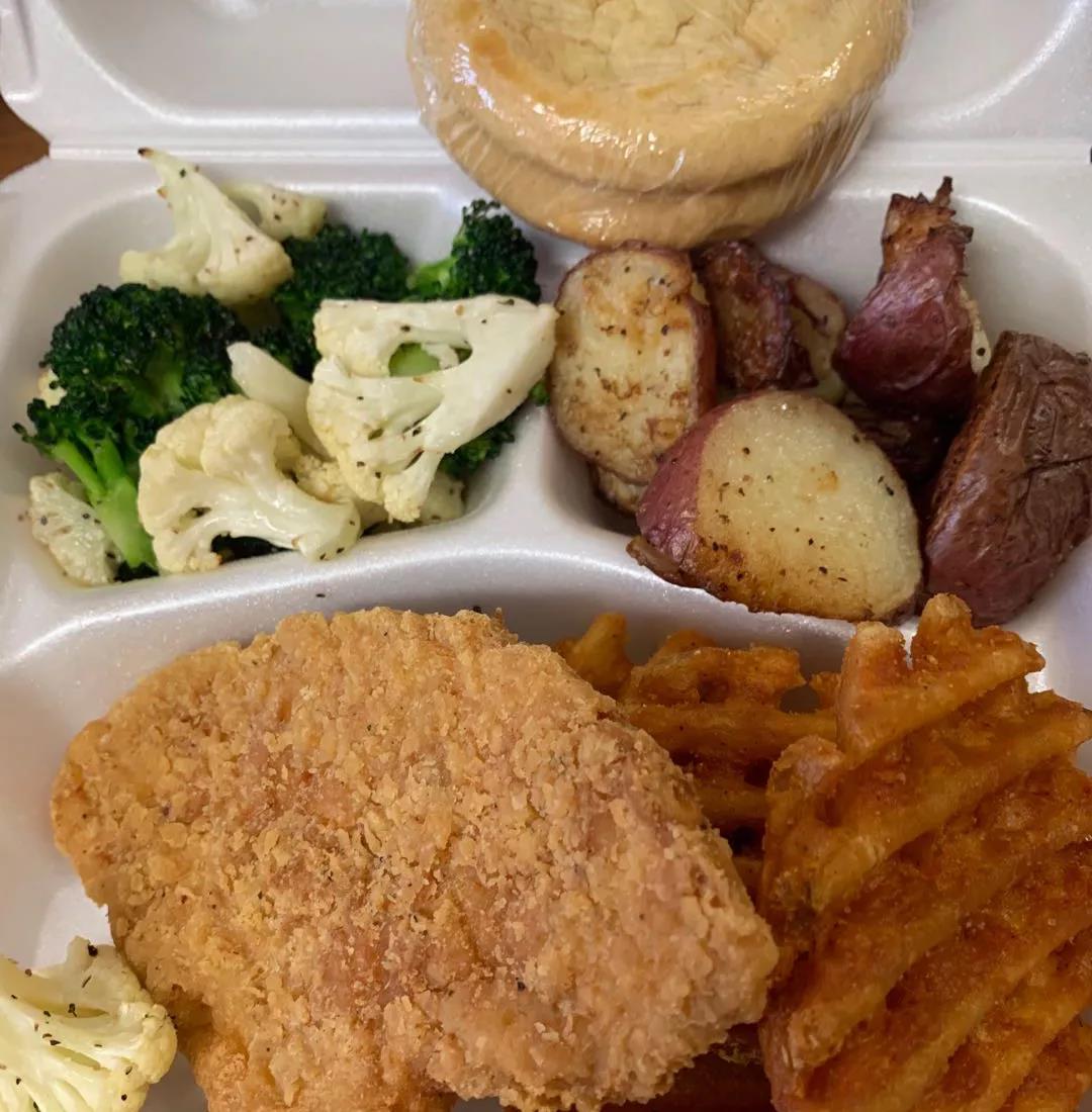 食堂工作人员会问你需要什么,然后替你装好打包盒。虽然菜式比以前少了不少,但是好吃的东西还是挺多的,每日的甜点也都少不了,每次去都能打包到一顿满意又期待的餐。
