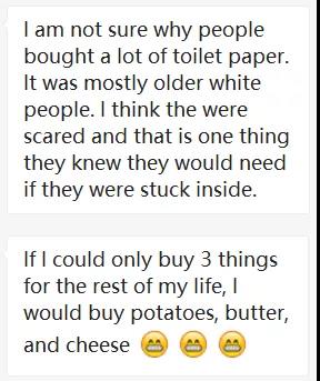 采访显示,其实美国老员工并不是很清楚为什么会有一大群人会抢购厕纸。有的人认为可能是出于过度恐慌而造成的盲目从众消费,从而大量抢购厕纸一类的生活用品。另外,在一些疫情并不是特别严重的地区,有些美国人并没有选择居家自我隔离,仍然会外出遛狗、运动,随时去超市补货。在购物首选方面,绝大数人会选择食物、水、洗护,以及洗衣用品。