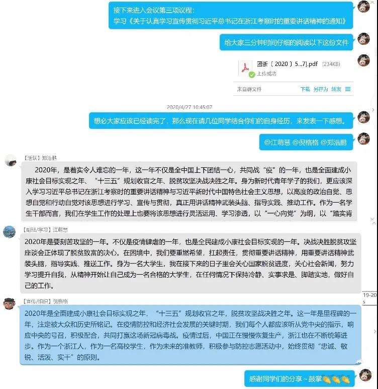 支部成员积极认真学习讲话原文,准确理解和把握习近平总书记在浙江考察时的重要讲话精神与对浙江工作提出的一系列重要指示精神的内在逻辑,深刻意识到“十三五”规划在浙江省的重要性。支部成员总结:作为新青年,要树立远大志向,勇担时代重任,积极响应国家号召,发挥自己作用,传承中华民族伟大精神,砥砺前行。