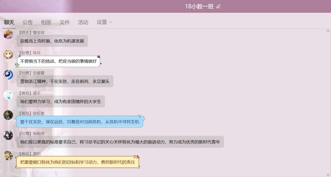 通过学习文件,支部成员以直观的形式学习讲话原文。学习后,支部成员向自己提出“三要”:要“不畏惧当下的挑战,把应当做的事做好”,干在实处、走在前列、勇立潮头;要以更高的标准要求自己,将习近平总书记的关心关怀转化为强大的奋进动力,努力成为优秀的新时代青年;要明确自己的家国情怀,树立正确的价值观,努力学习,成为国家栋梁。