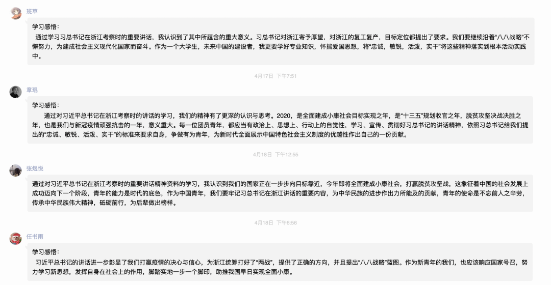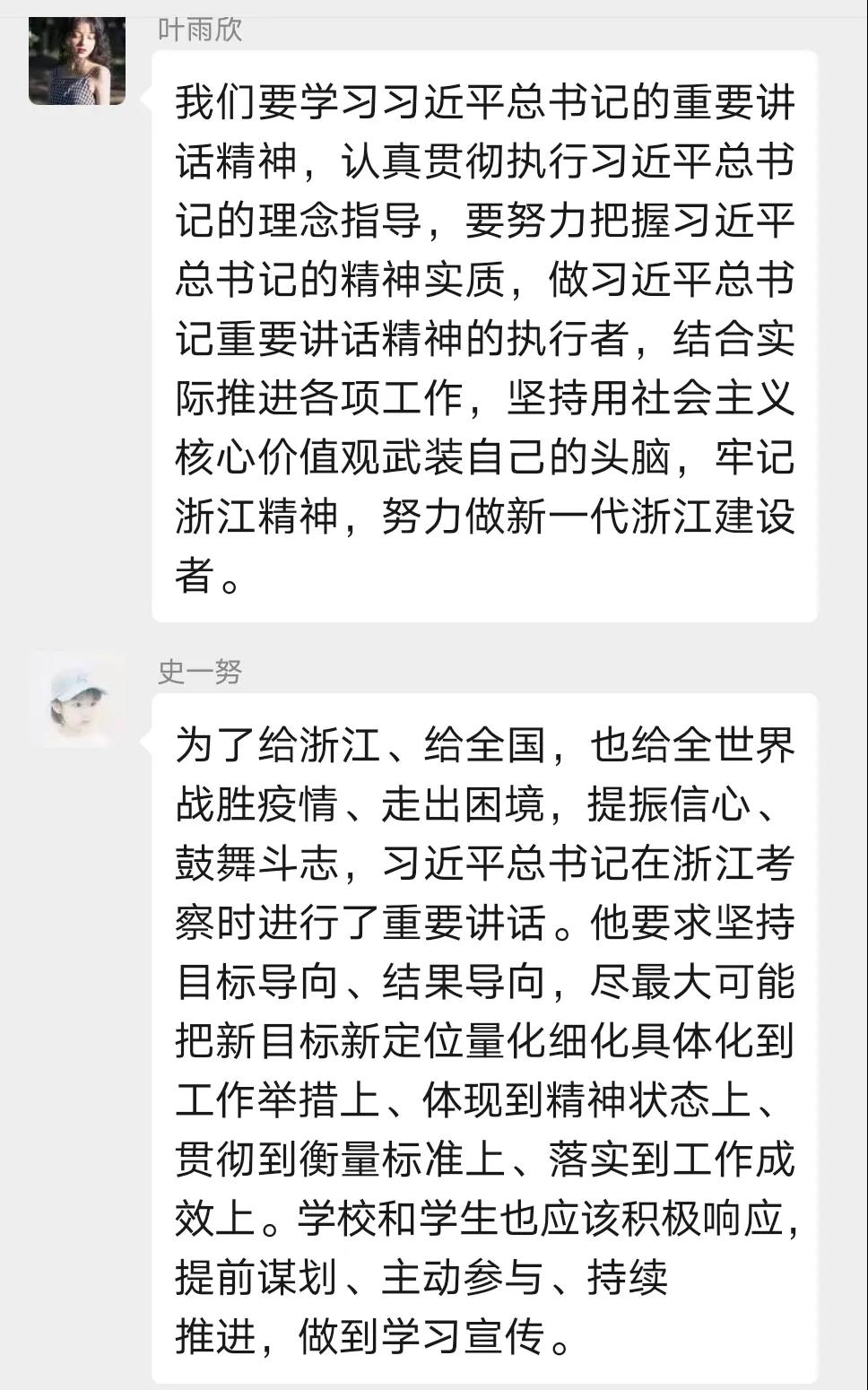 为更好地学习贯彻习近平总书记在浙江考察时的重要讲话精神,真正做到学以致用、用以促学、学用相长,支部成员特于4月17日、4月20日多次开展线上学习活动,扎实学习讲话原文,切实将讲话精神作为“青年大学习”的重要内容。通过这一系列活动,团支部持续推进对讲话精神的学习宣传,把习近平总书记对浙江的关心关爱和殷切嘱托全面、准确、及时地传达到团支部里每一位团员青年。