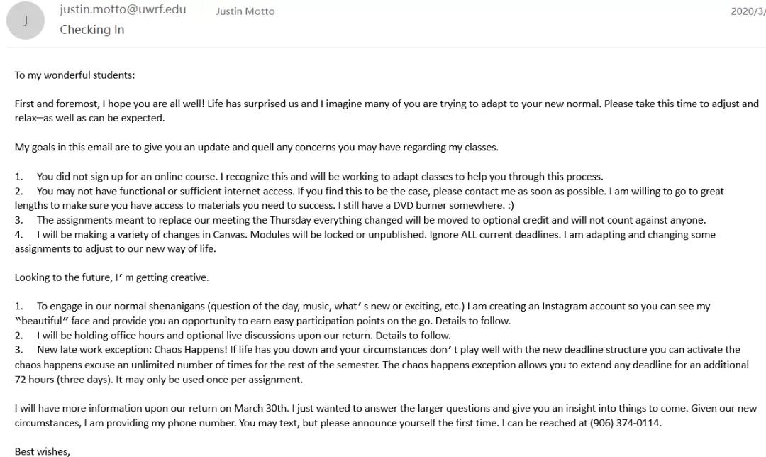 网课对于老师而言也是一项巨大的挑战。假期对于所有人而言都本应是一段非常放松的时光,而教授也通常不会在春假回复任何非紧急邮件。但是在此期间,他们一边不断地通过邮件关心大家的现况,一边着手于修改之后两个月的学习安排并告知大家课程动向。老师们都会详尽地告知所有已经确定的课程修改,并鼓励大家坚持正常地完成学习。由于不用出房间上课的原因,老师们也很关心员工是否记得上课,是否理解课程内容,还发了邮件专门提醒,真的很细心。