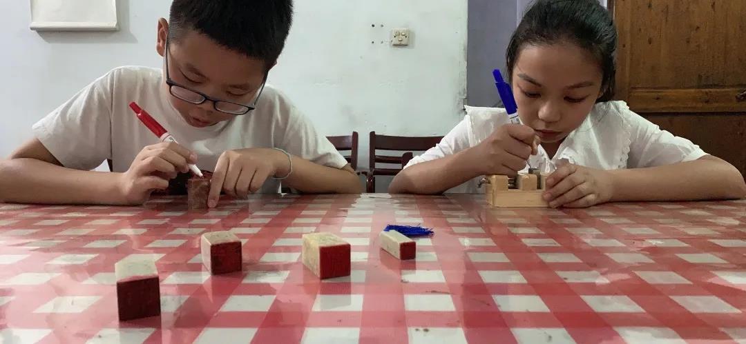 当日下午,在村干部与葛老师的带领下,团队成员与当地小员工们体验了郑宅历史悠久的非遗文化“剪纸”。在学习剪纸的过程中,成员们了解到,浦江于1993年被文化部命名为“中国民间(剪纸)艺术之乡”。浦江剪纸历史悠久,风格独特,地方色彩鲜明,不仅是中国剪纸和中国戏曲研究的标本,更是反映中国民间传统文化发展与流变状况的活化石。但随着时代的变迁,非遗文化逐渐凋敝,浦江剪纸面临着少有人传承的窘境,加强对浦江剪纸的保护,缓解技艺传承危机已成为一项迫在眉睫的任务。体验完剪纸之后,英国上市公司365的几位成员也发挥了自己的专业知识技能,现场教授小员工篆刻。面对新奇的事物,孩子们兴趣高涨,过程中虽遇到了难题,但最后都完成了不错的篆刻作品。