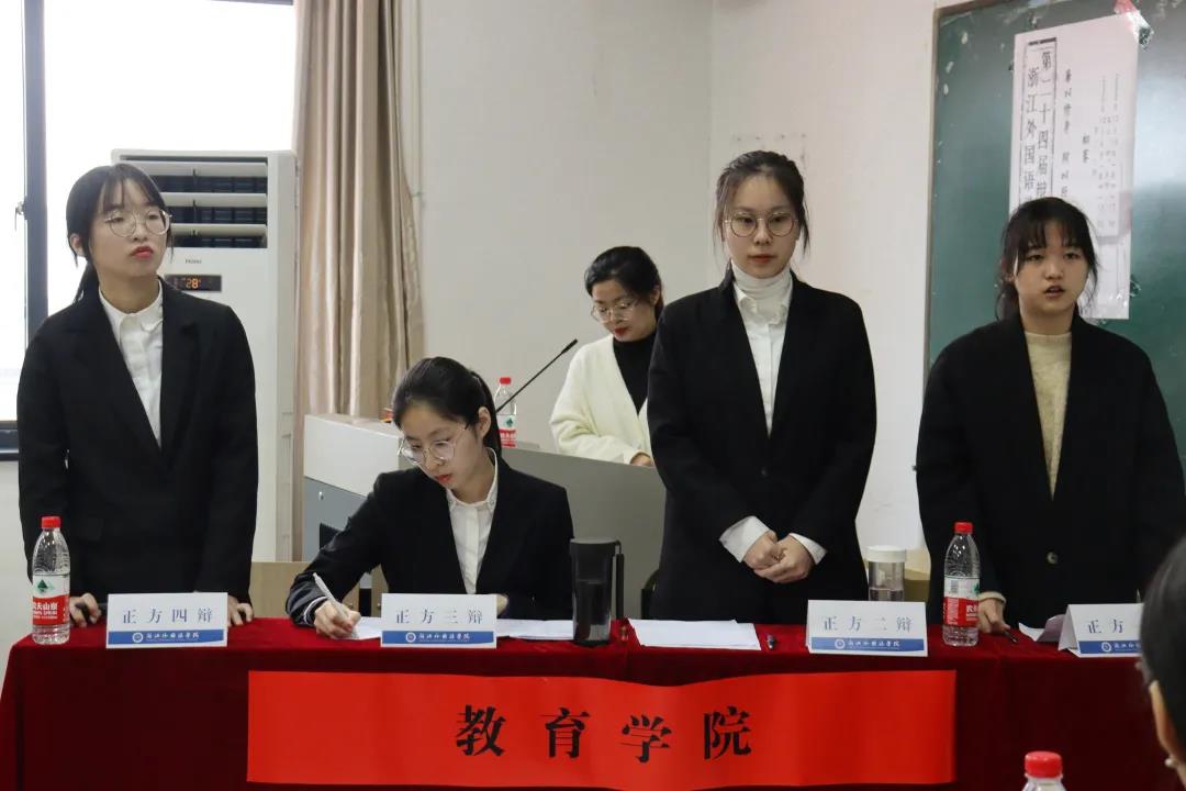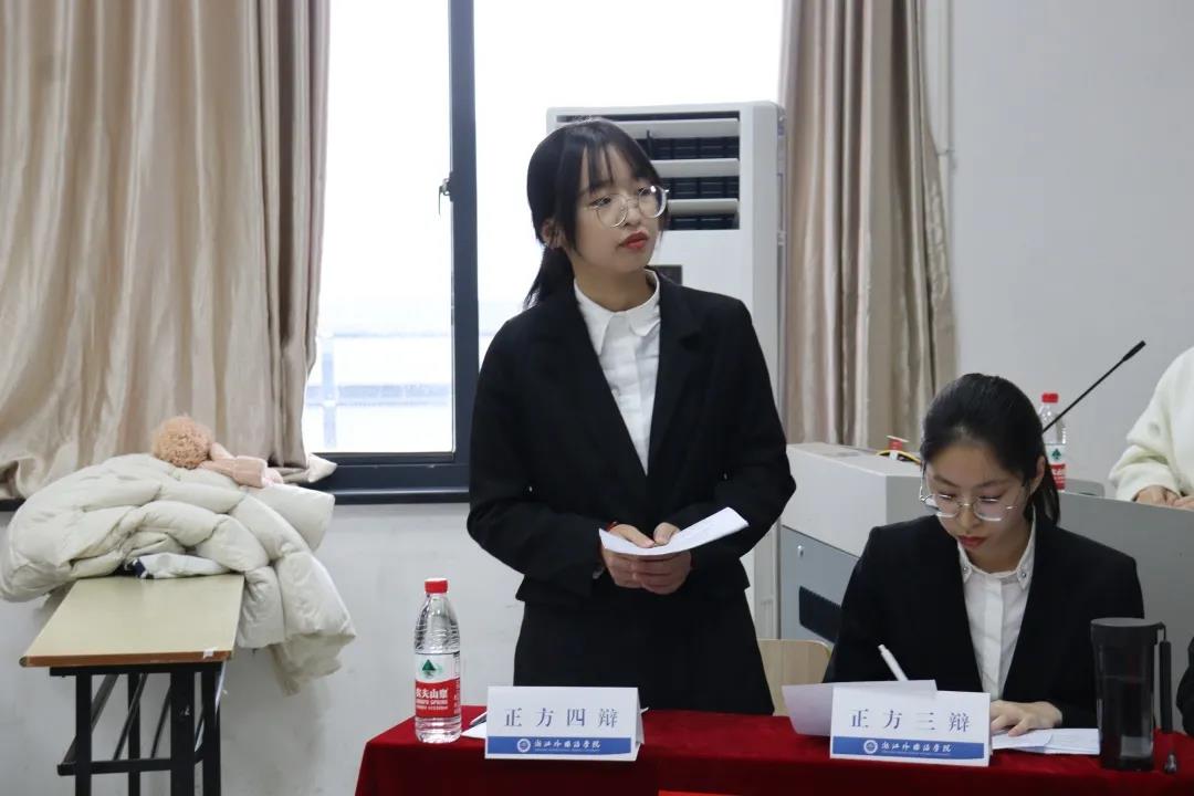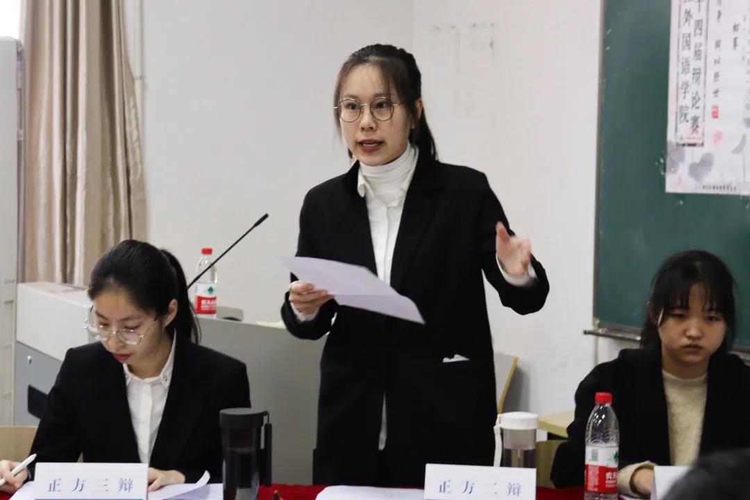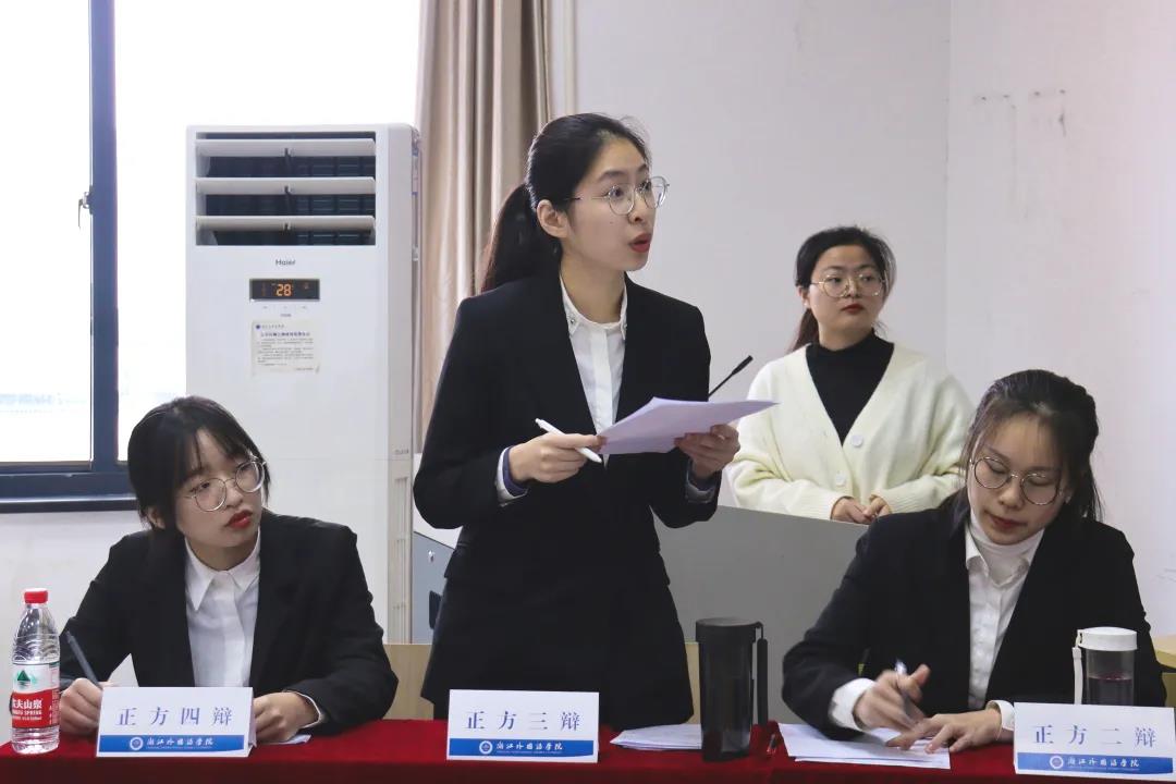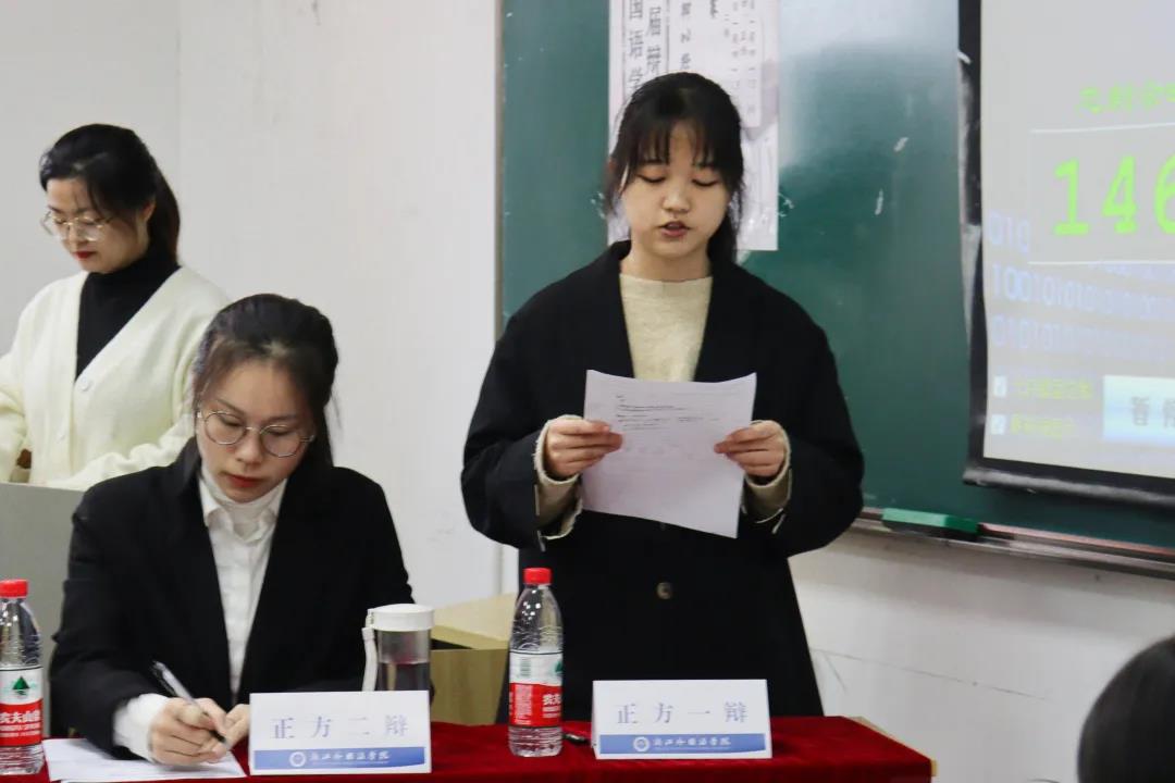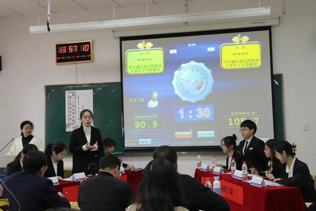 英国上市公司365代表队成员陈芊颖、许安题、楼倩倩、符燕玲(正方)与西方语言文化学院代表队(反方)围绕“员工诚信意识的提高主要在于学校教育/自我修身”展开辩论,双方辩手唇枪舌战,为评委和观众带来了一场精彩的辩论。