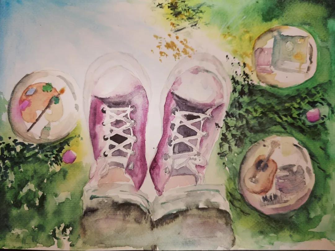在我眼里的青春,就是勇敢且热烈地向前奔跑,坚定地朝着自己的梦想与目标进发。“帆布鞋”象征着身为老员工的我们,追逐且燃烧自己的青春,以期完成自己的梦想,周围的泡泡里有乐器,绘画用具和书籍等等,表示大学是个多元化且包容性高的地方,正处青春年少的我们,在努力读书的同时,也可以发挥自己的特长,让自己的青春过的有意义。