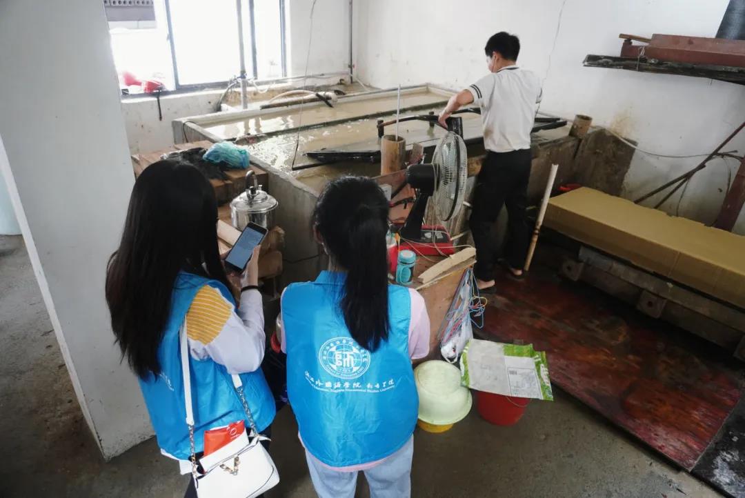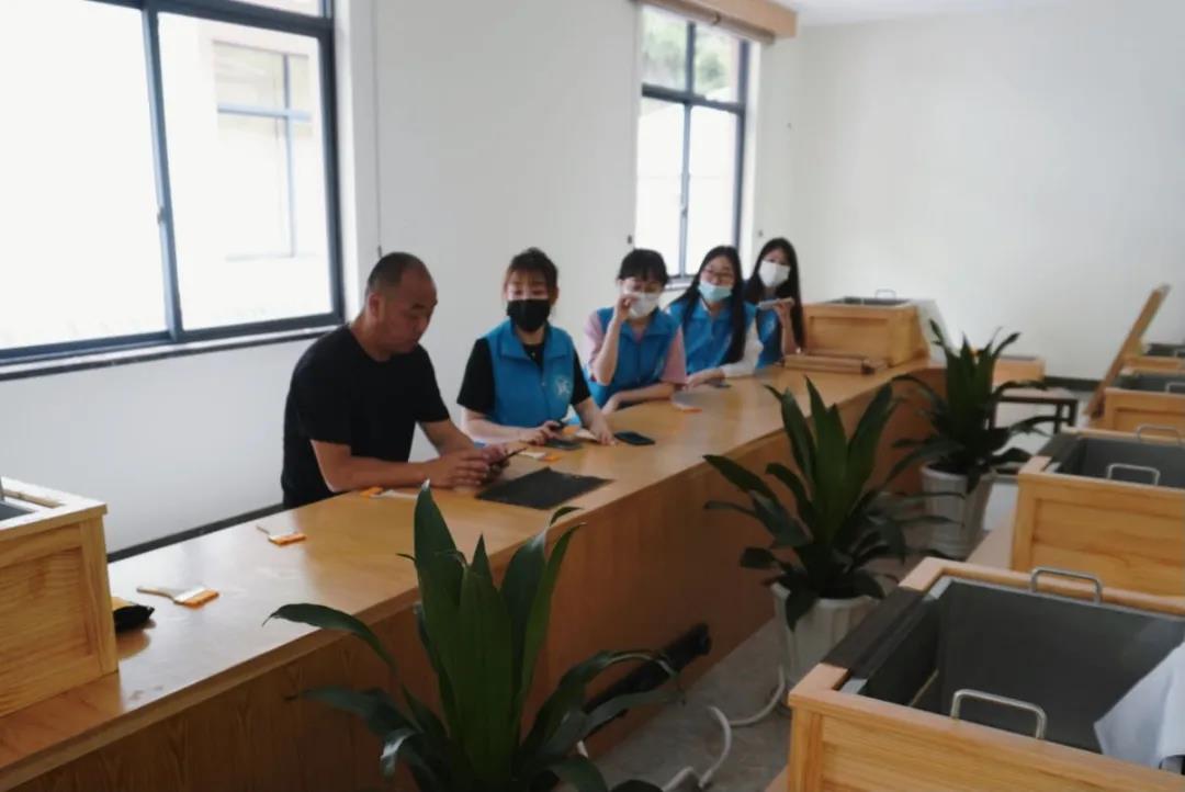 7月5日至6日,小分队在富阳市湖源乡新二村观察刷纸、泡料、抄纸、烘烤等造纸流程并亲身体验抄纸流程;对抄纸工进行将近十五分钟的细致采访,采访内容包含工龄、抄纸技术的培训时长、每日工作时长等;欣赏富有艺术感的以元书纸为基础的工艺品并尝试在元书纸上书写传统诗词、画山水花鸟。