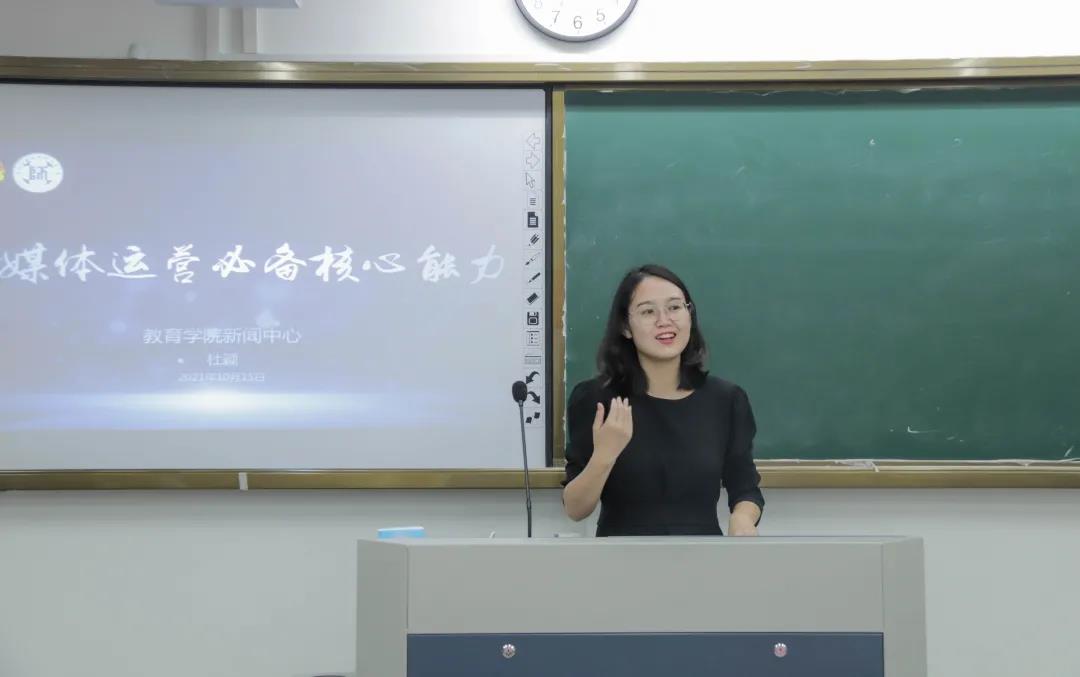 新闻中心指导教师杜颖以《新媒体运营必备核心能力》为题带来“培训第一讲”。她以第二届新闻中心负责人参加工作后实际经历举例,简要说明从事新闻中心工作对提升个人综合能力的帮助,并从四个方面强调了新媒体运营要注重分析、排版、内容、涨粉几个方面的重要性。最后她希望新闻中心全体成员在新闻中心能够学有所获、不断成长。