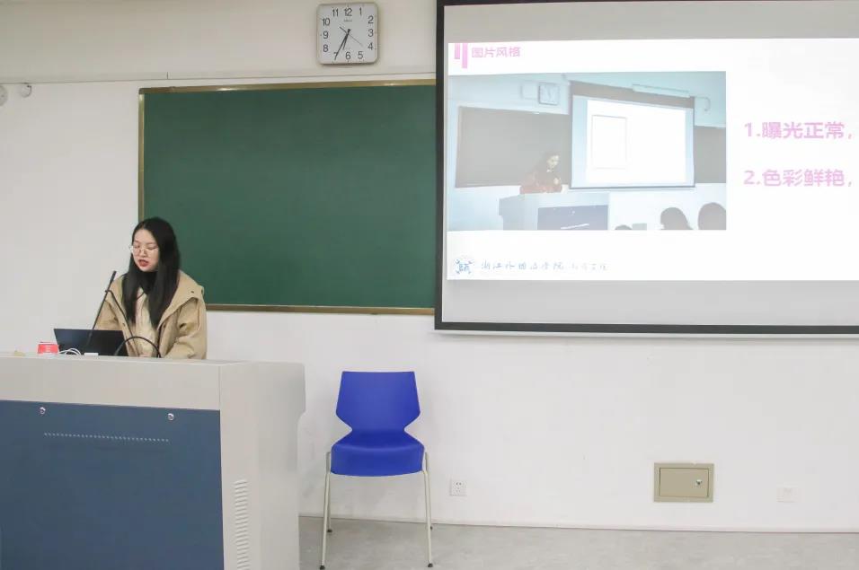 视觉传达部负责人王欣怡从设备调试、运镜、构图等方面总结视频拍摄的相关技巧和经验;负责人姚艺从理论出发,结合剪辑软件的实际操作,同成员们讲解视频剪辑的基本思路和操作。