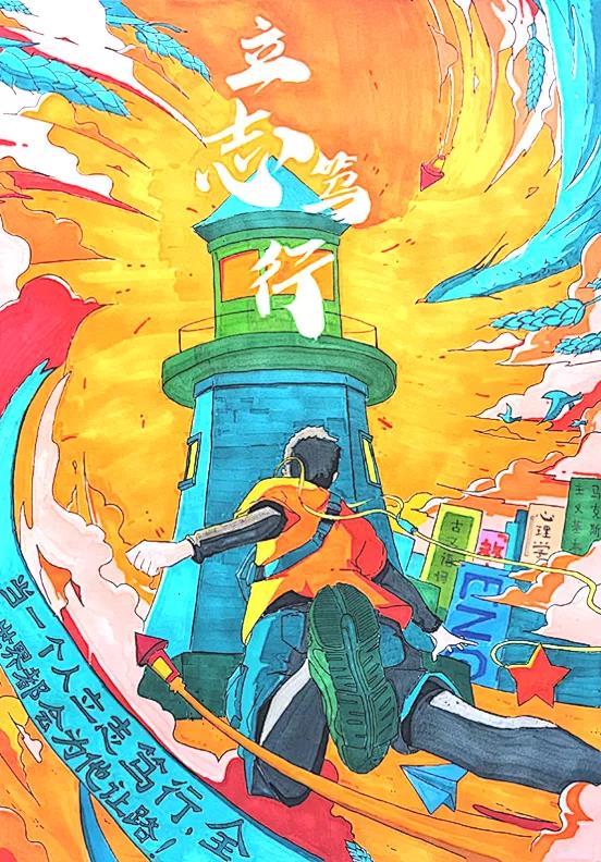 “立志和山”激扬起新时代青年的强大思想共鸣,“笃行万里”鼓舞着新时代青年为建设祖国的大好河山贡献力量。海报主体以中国地图为背景,暗示着祖国的疆域辽阔和国土的不可分割,万里长城则象征着中华民族走向现代的艰难险阻。在海报制作过程中,结合了中华传统的水墨以及现代艺术拼贴,寄托了对祖国从文明古国到现代强国的热爱。