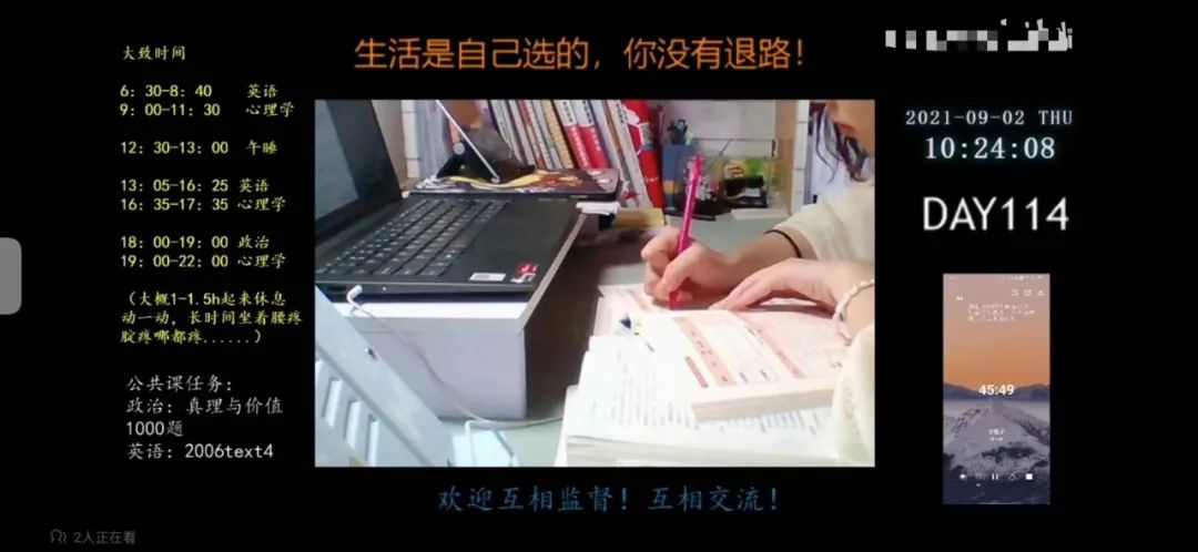 为更好地准备考研,徐子涵充分利用大二的暑期时间留校复习。六点起床,八点早餐,十二点午睡,二十四点睡觉,她的作息定时定点,严格规划学习与休息时间,集中精力在规定时间内高效学习。