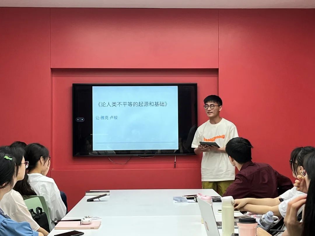 周智达同学向大家介绍了卢梭的《论人类不平等的起源和基础》。从卢梭的人生背景讲起,具体从自然状态与和平状态,私有制的产生,不平等的发展三个方面讲到技术的产生,人和动物的差别,法律及官职的设立等等。该同学以深厚的功底,向同学深刻且生动地讲解了复杂的问题,使人惊叹连连。最后以“男女关系是否不平等为题结尾”,引起人们无限的思考。