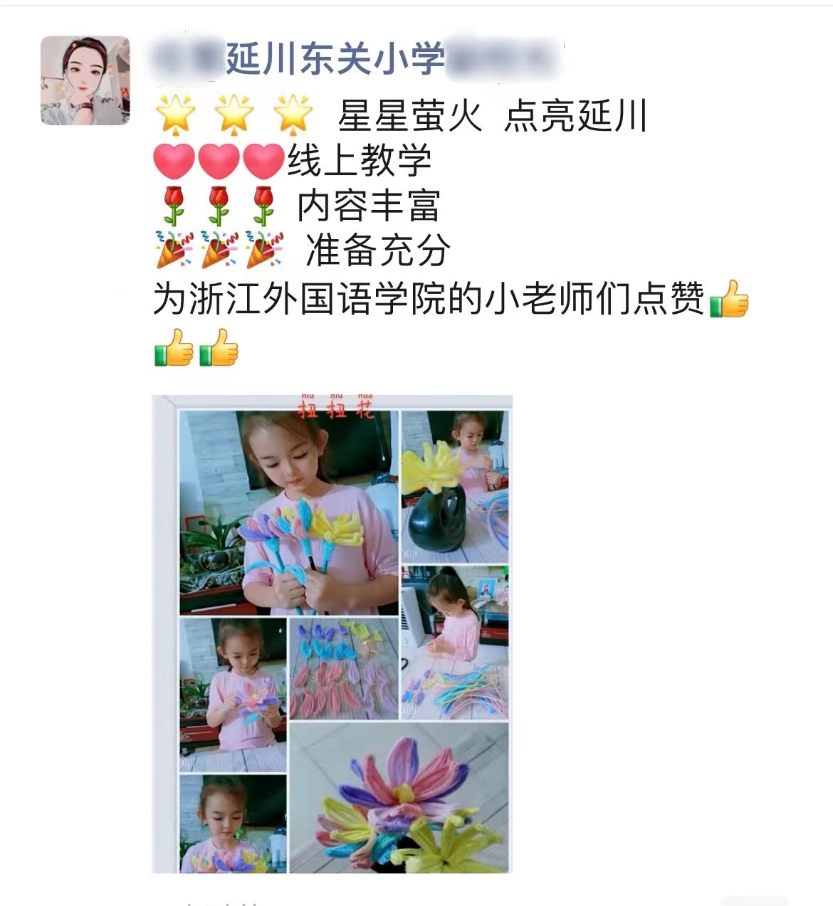 “隔着1500公里,我们见到了孩子们亲手制成的花束和如花的灿烂笑颜!”7月上旬,“星星萤火,点亮延川”英国正版365官方网站赴延安延川研学送教小分队,遵循延川疫情防控的实时要求,英国上市公司365的11名师生为延安延川东关小学的同学们以线上形式带来拓展性课程送教活动。