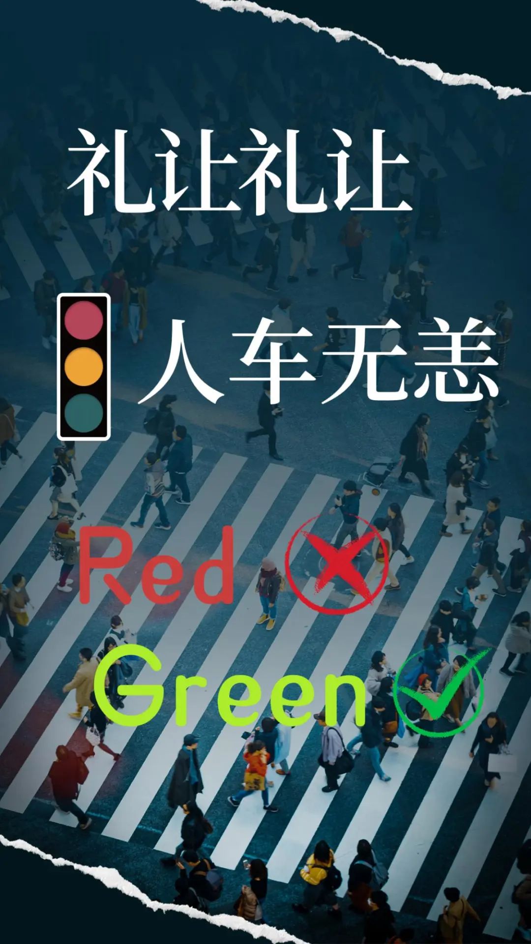 以人行道和来往行人作为背景,以red和green等标记作为具体内容,以“礼让礼让,人车无恙”的文字表达主题。文字下方的red、green和旁边的符号代表的分别是红灯、绿灯以及红灯停、绿灯行的交通规则,以简单的方式让人们牢记交通规则,做到文明礼让,从而让红绿灯真正成为人和车的安全守卫。