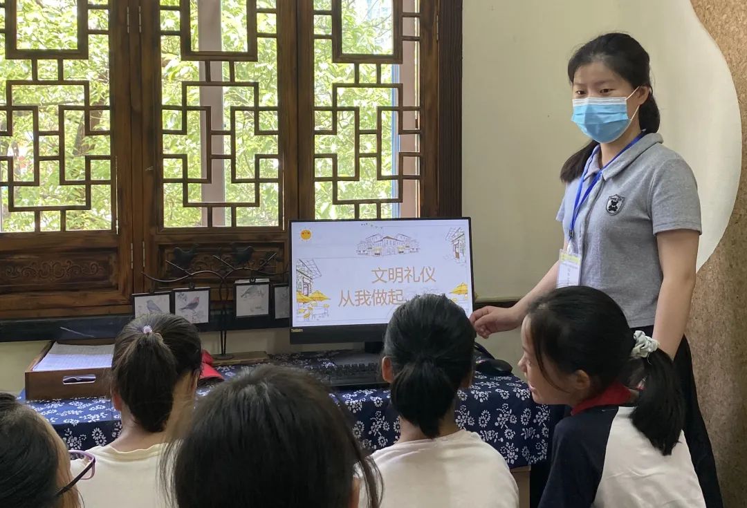 实践队员在宣讲室开展文明礼仪课程