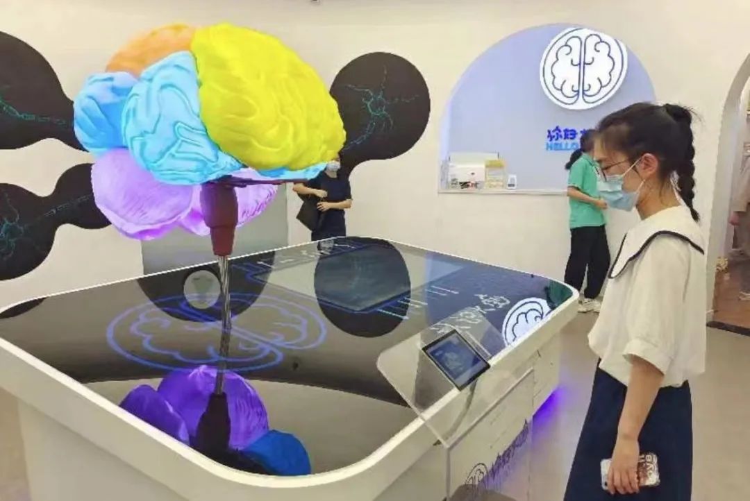 在创新大厦一楼的“脑科学馆”,实践团队通过参观体验设备、交互场景等,了解到相关设施不仅能够让体验者深层次认识大脑构造,也有助于青少年缓解心理压力、调整行为、考前放松。