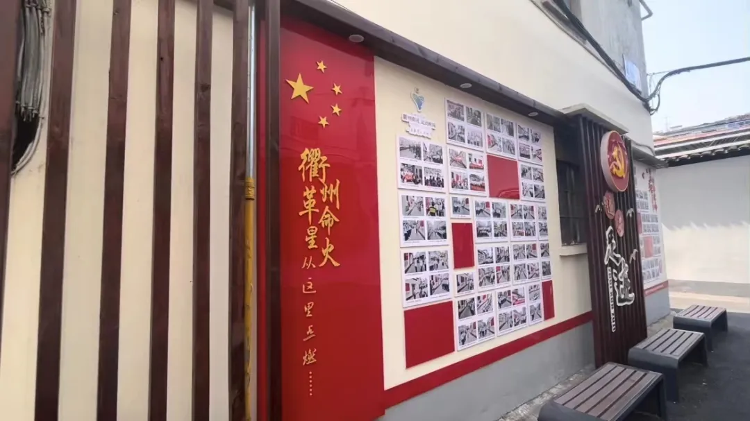在浙江省衢州市柯城区中共衢县支部旧址,展现在成员面前的是社区为“普及红色知识,推进红色教育”打造的红色党建长廊,仔细阅读后,团队成员深刻体会到衢县党建的峥嵘岁月。