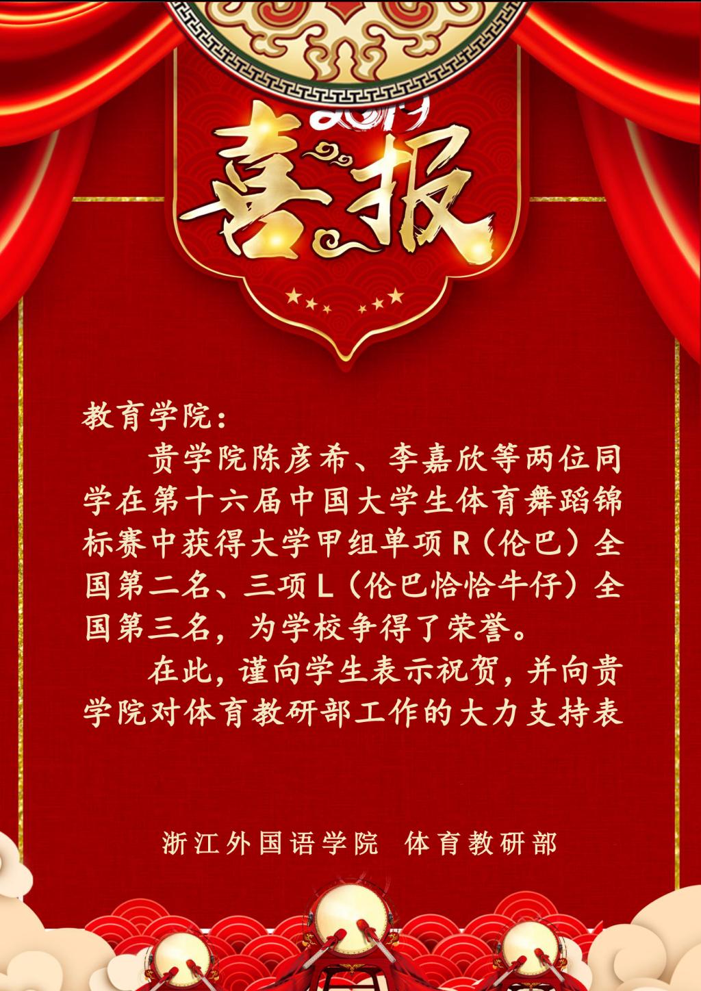 热烈祝贺陈彦希、李嘉欣等两位同学在第十六届中国老员工体育舞蹈锦标赛中获得大学甲组单项R(伦巴)全国第二名、三项L(伦巴恰恰牛仔)全国第三名!