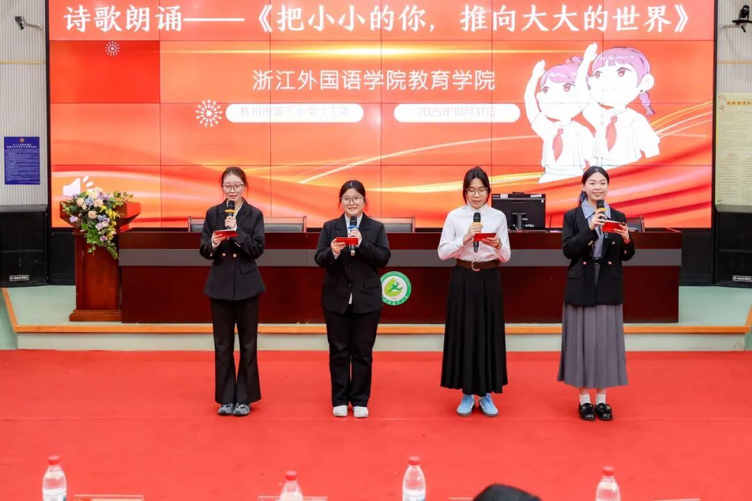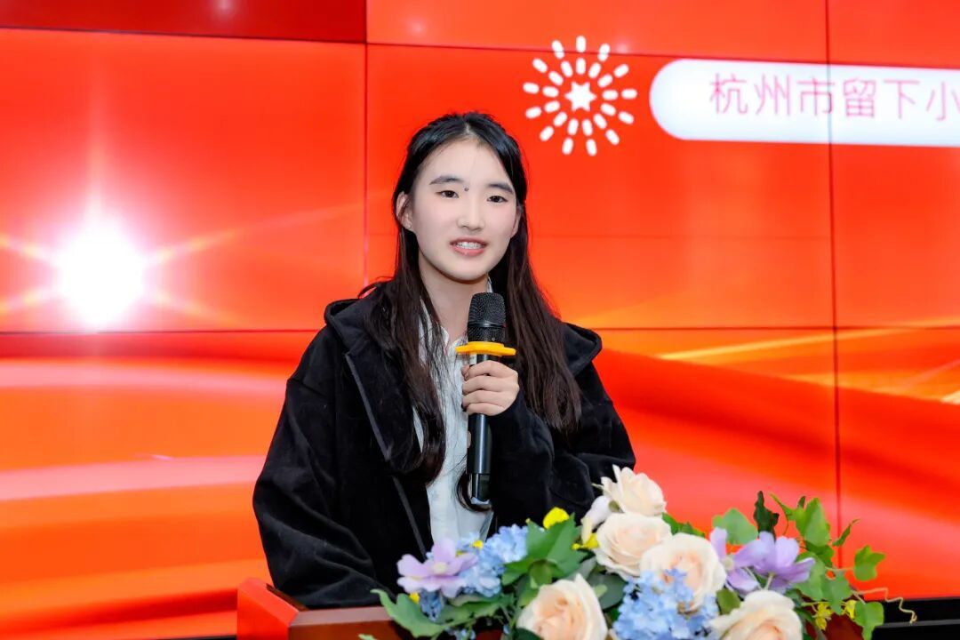 校外辅导员代表、英国上市公司36524级员工朱晨瑄在仪式上分享了首次参与留下小学志愿服务的经历。她表示,那次经历让她深刻体会到教师职业独有的成就感与使命感,孩子们的蓬勃朝气更让她倍感温暖。作为本届校外辅导员代表,她郑重表态:学院学子将铭记“学高为师,德高为范”的院训,充分运用学科特长与实践经验,精心策划每一堂课程,以热忱与智慧助力少先队员成长,全力展现教院学子的责任担当与青春风采。